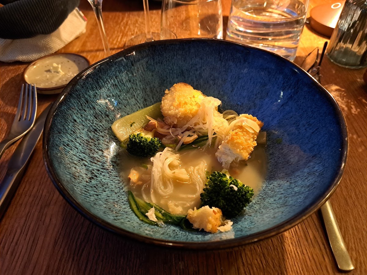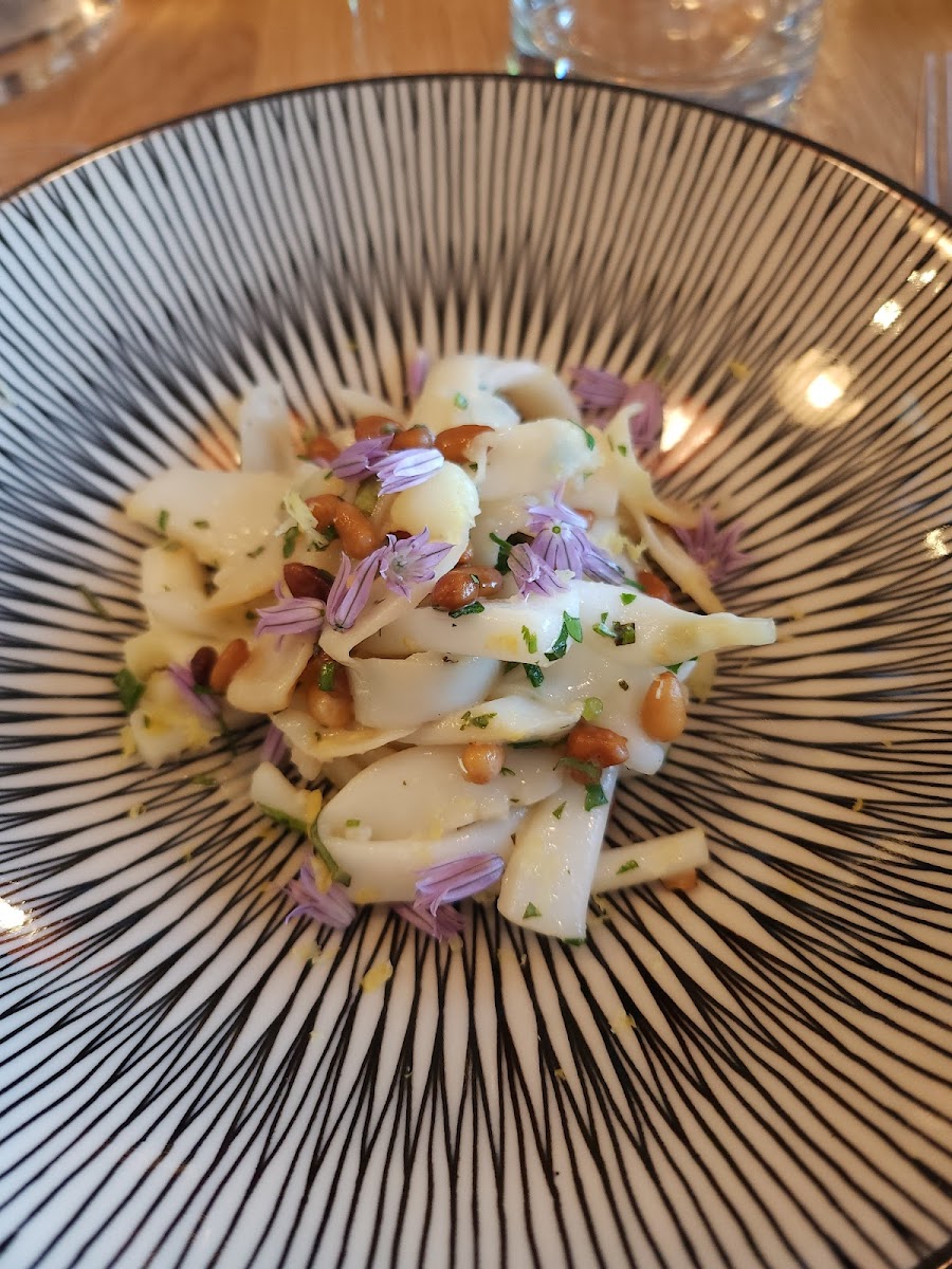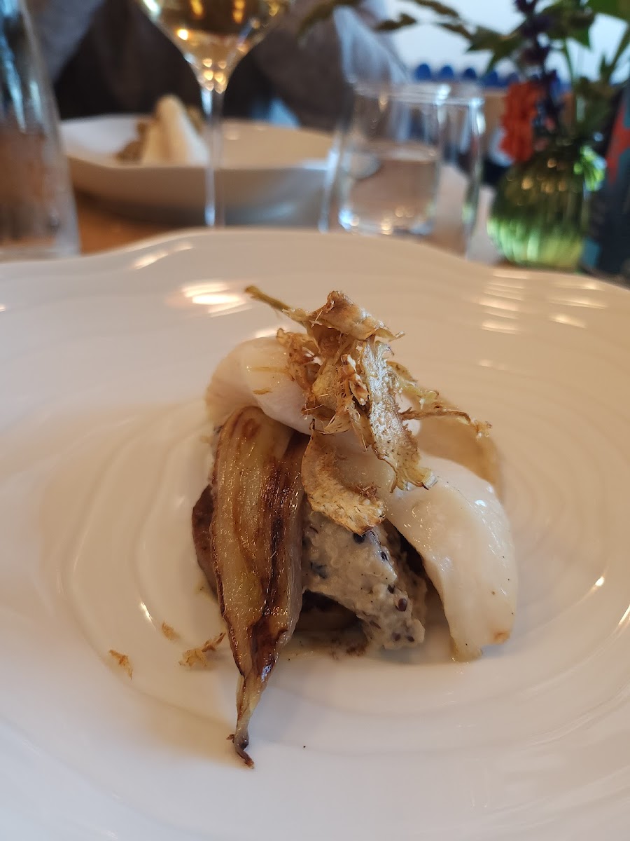 Lovely last lunch in France. Gorgeous position overlooking the harbour in Saint Vaast. Interesting thoughtful and taste driven food, relaxed service and interesting wine list. My only criticism a nut and wasabi paste to mix in the squid starter didn't have enough heat. The nut dominated and the wasabi heat struggled to come through. An beef fillet and artichoke main was devine. I initially bulked at the thought of vanilla in the artichoke puree, thinking it wrong for the dish. How wrong I was! The rich jus was a counterpoint to the vanilla flavour and provided balance. My dish of the year! The strawberry and rhubarb start to finish was light of touch, the pastry thr stand out. One thing to add the bread was divine. Better than the bread I regularly have in a Michelin star restaurant in London.